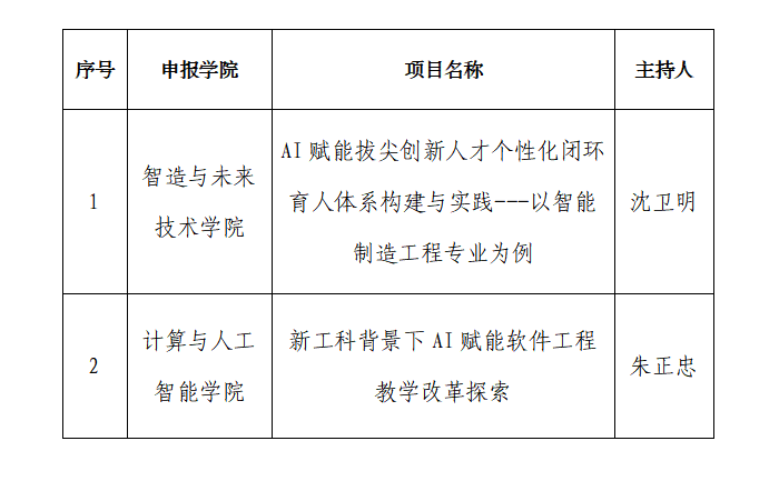 根据《福建省教育厅办公室关于开展2025年本科高校教育教学研究项目申报工作的通知》(闽教办高〔2025〕1号)和《关于开展2025年福耀科技大学教育教学研究项目暨福建省本科高校教育教学研究项目申报工作的通知》((2025)福耀科大教6号)要求,经个人申报、学院初审推荐及校外专家组评审,拟推荐2个项目申报2025年福建省本科高校教育教学研究项目,现将名单予以公示。