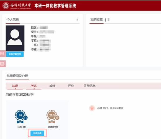1.登录福耀科技大学“本研一体化教学管理系统”(jwxt.fyust.edu.cn)(以下简称教务系统)进行选课。