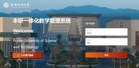 点击“CAS用户登录”输入智慧福耀科大账号和密码登录,首次登录智慧福耀科大初始密码为Fyust@身份证后6位。如还未更改初始密码,请及时进行更改。